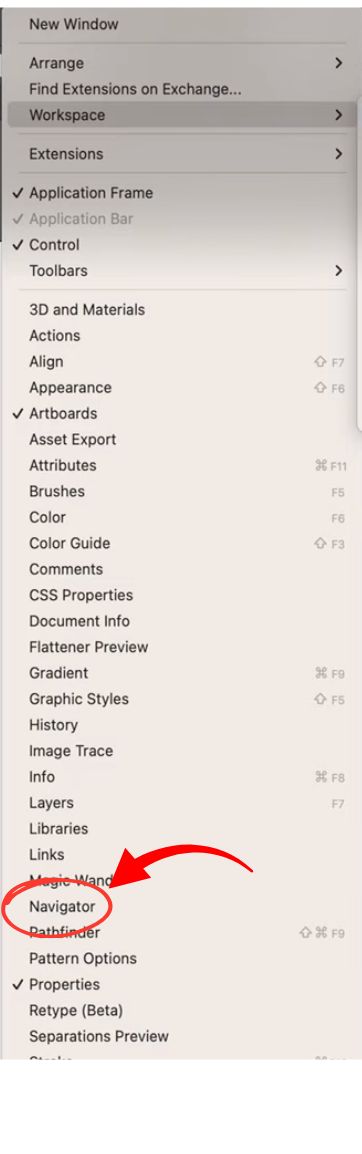 - Scroll until you see "Navigator" (it's usually between "Layers" and "Pathfinder")