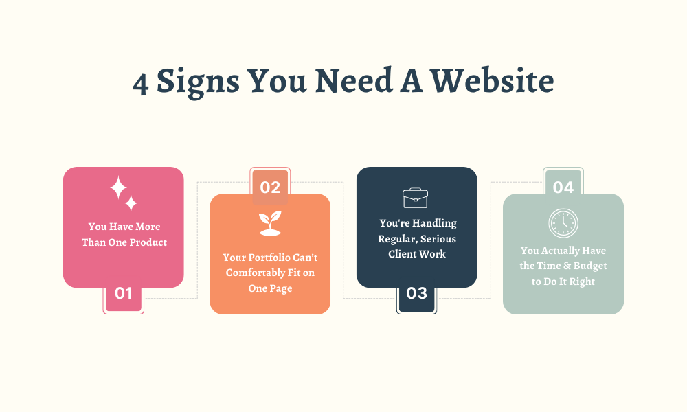 When your body of work needs organization — by collection, by theme, by product type — that's a signal you need dedicated portfolio pages. Your landing page can't do all that heavy lifting forever.