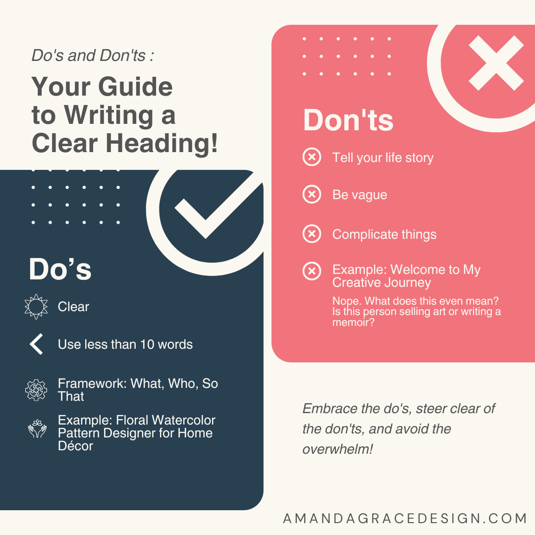 Your headline is doing the heavy lifting here. It needs to answer "what do you do" in under ten words. If you're not sure what yours should say, try the "What, Who, So That" framework: What you create + Who it's for + So that they get what result. For example: "Hand-drawn florals for children's brands that feel like a warm hug." Done.